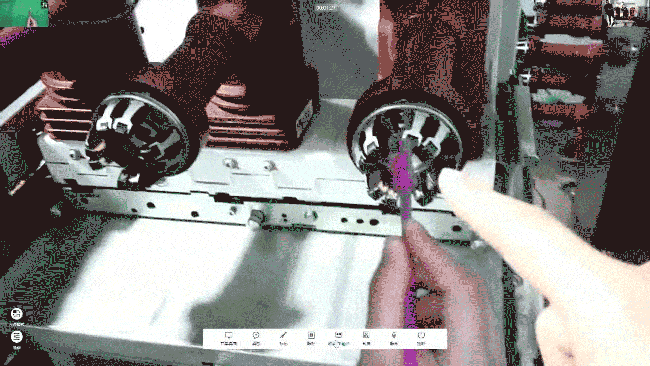 AR融合技术可将实时拍摄的专家指导信息与现场场景智能融合,融合后的新画面会呈现在双方视频沟通的屏幕中,现场操作人员可通过屏幕中的画面直观看到专家的操作手势、具体操作位置等信息,跟随专家的指导示意和讲解一步步操作,轻松解决问题。
